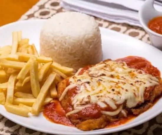 Empanado, com molho de tomate e mozzarella gratinada.