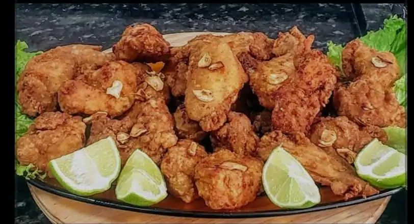Pedaços de frango frito salpicados com alho e molho maionese.