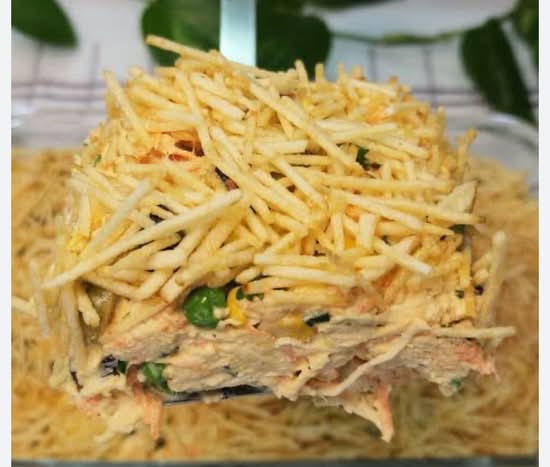 Frango desfiado, cenoura, azeitonas, maionese e batata palha.